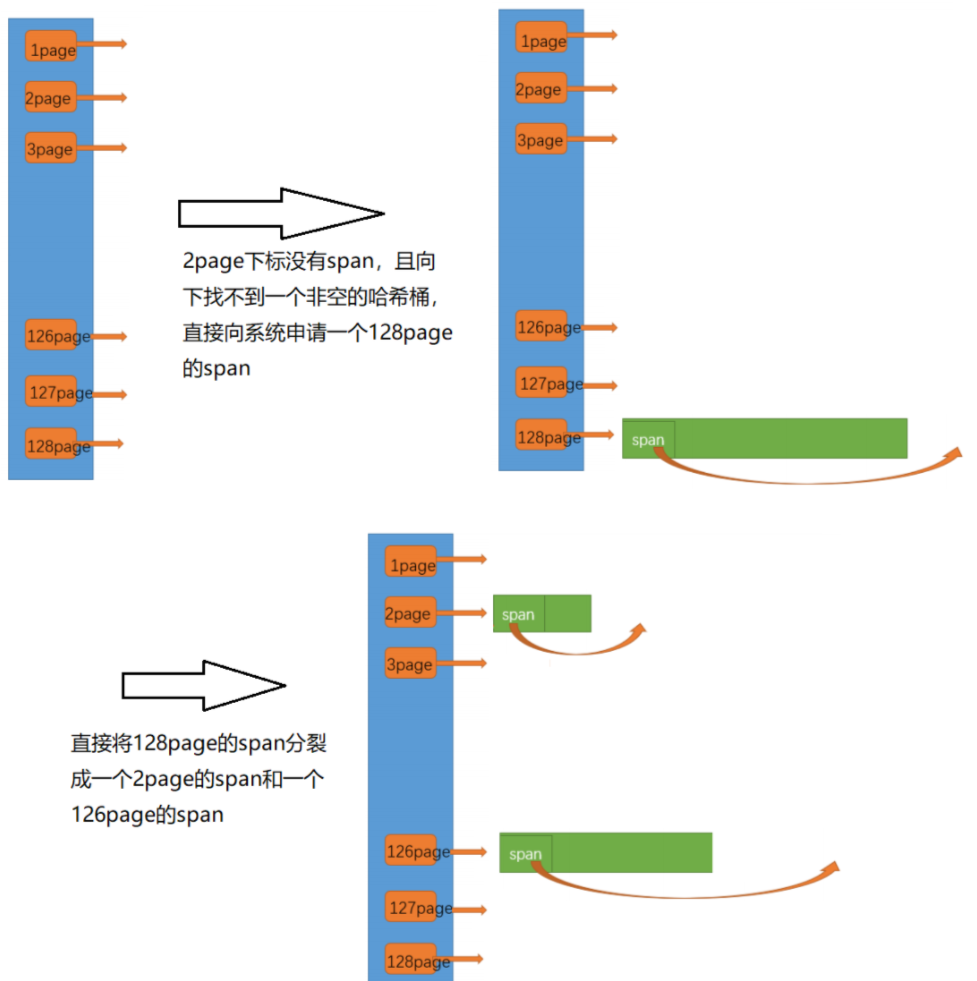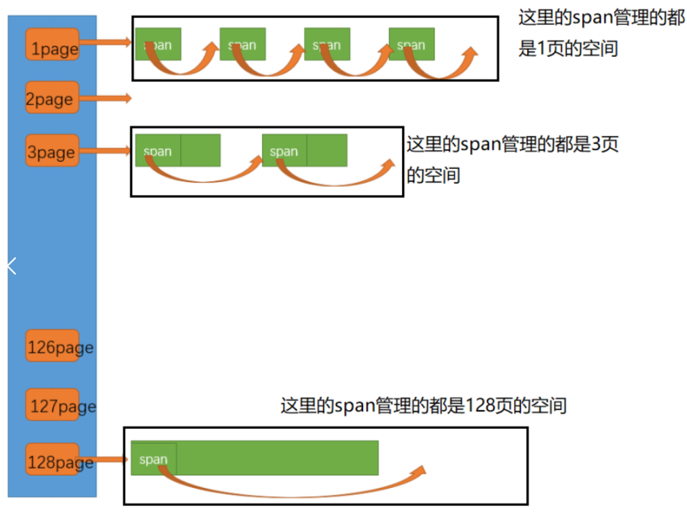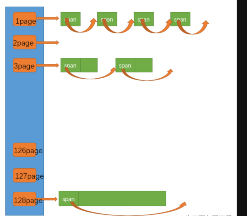 pc中会有多个span的结构体,span会管理多个页大小空间,pc是一个管理页,一页就是4/8KB,这里有解决碎片问题。