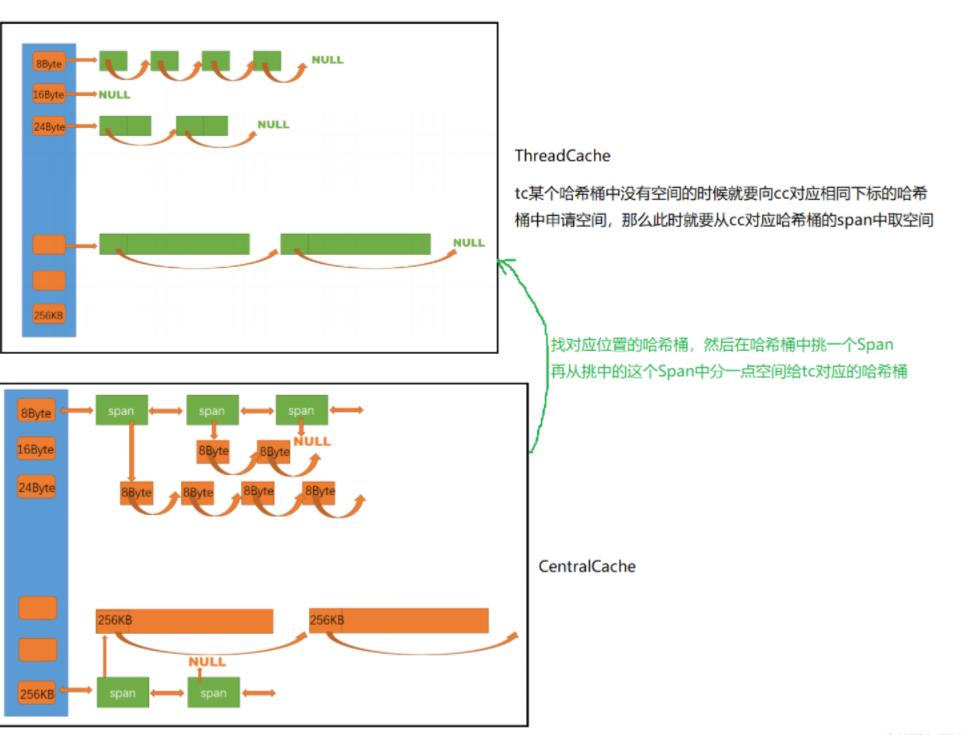 当线程的tc中空间不够时,就会向上申请,也就是cc,这里需要注意,当多个线程向cc申请空间时,不一定要有锁,只有对同一个桶申请才要加锁,cc是由哈希桶构成的,每一个桶也有着空间。