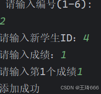 若不存在:提示用户输入"成绩数量(整数,至少1)",再逐个输入对应数量的成绩(每个成绩为整数),组成`scores`列表,最后创建新字典`{"id": 输入id, "scores": 成绩列表}`并添加到`students`,打印"添加成功"。
