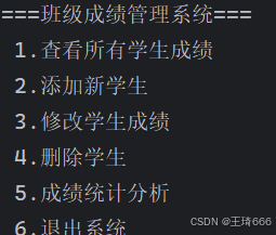 程序启动后,通过`print`显示固定菜单(菜单文字为字符串常量,不涉及字符串方法),用户输入1-6的整数选择功能,执行后返回菜单(选6则退出)。菜单格式:
