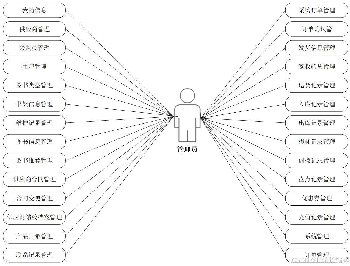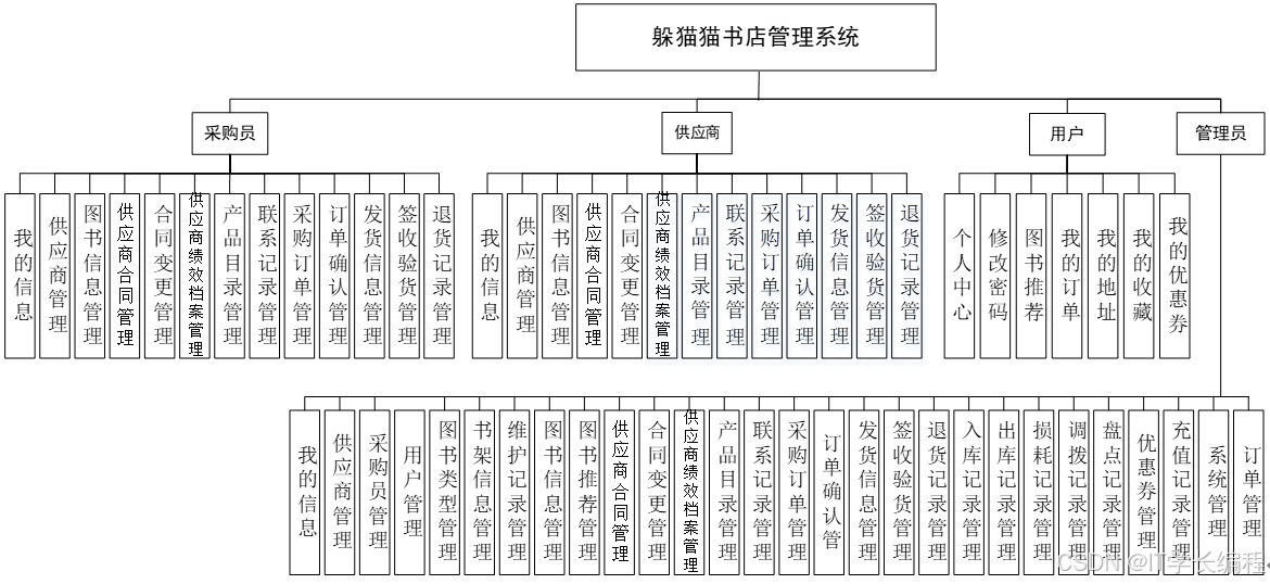 本系统系统围绕"人、货、单、库、券"五大维度设计功能:采购端集中维护供应商与合同,完成下单、验货、退货全流程;供应端同步更新产品目录、接收订单并回写发货信息;运营端以图书档案为核心,串联类型、推荐、上下架、库存(入库、出库、调拨、盘点、损耗)及优惠券规则;用户端聚焦个人中心,实现浏览、收藏、下单、地址与优惠券管理;系统端统一管理账号、角色与基础配置,各模块通过订单状态与库存数量实时联动,形成闭环。系统功能模块图如下所示: