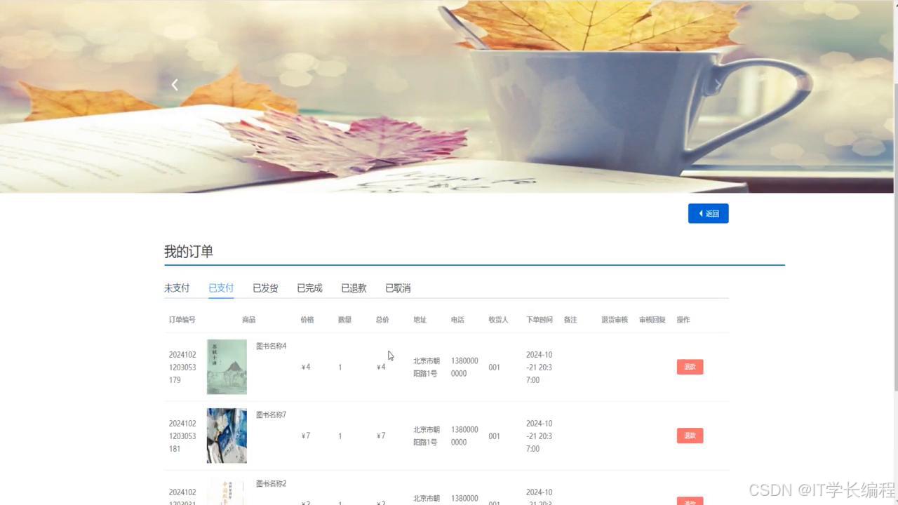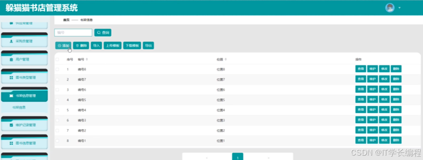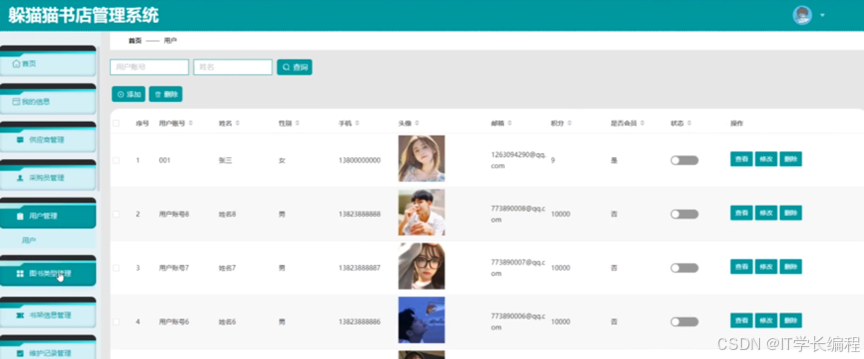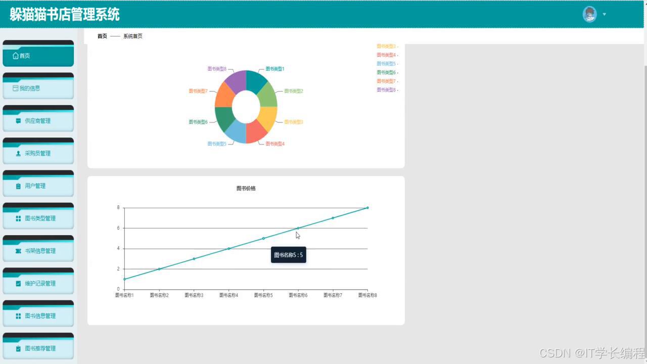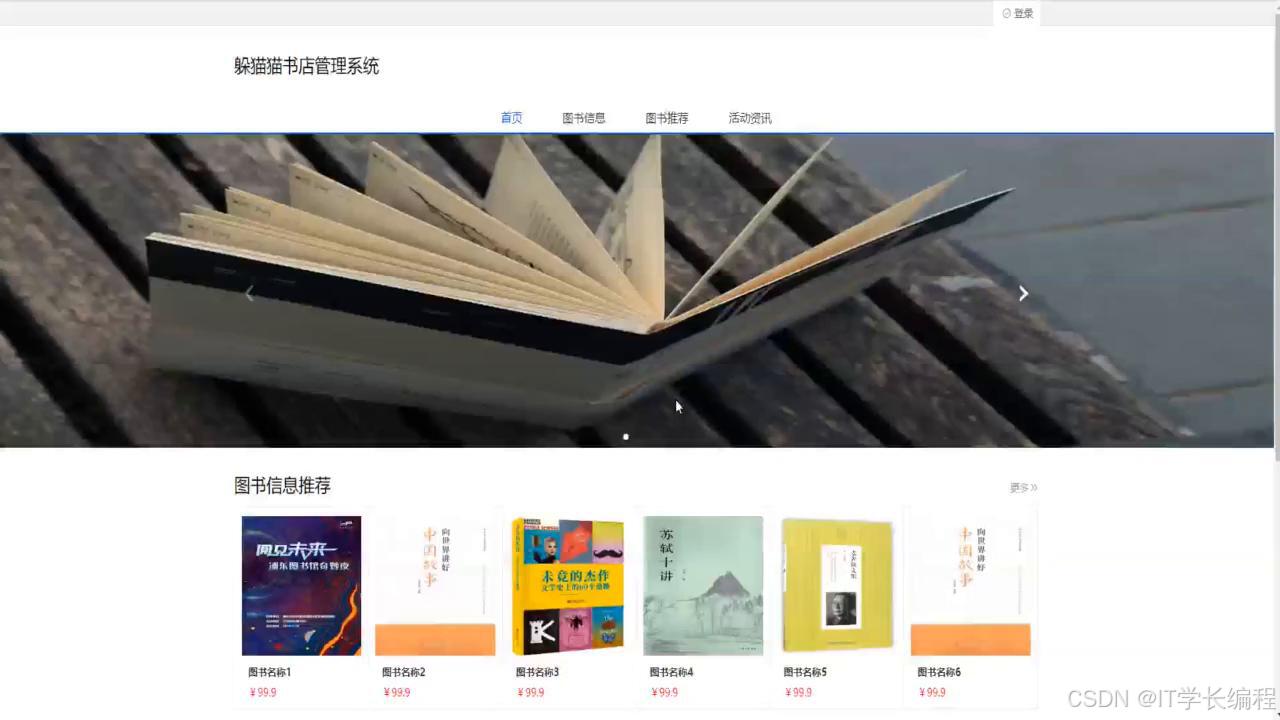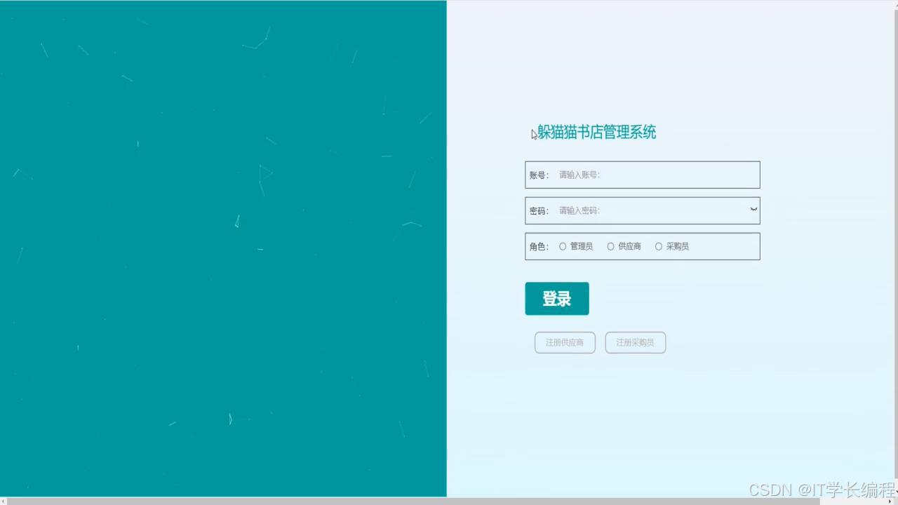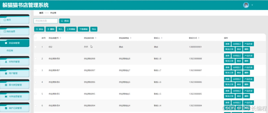 "书店管理系统"基于 SpringBoot+MySQL+Vue2技术栈,前后端分离。系统围绕图书流转全过程,为采购员、供应商、门店管理员及普通用户分别提供线上工作台:采购端完成供应商维护、合同签订、订单下发、验收入库及退货;供应端实现商品目录上传、订单确认、发货及绩效查询;管理端集中进行图书信息、类型、推荐、优惠券、库存调拨、盘点、损耗等日常运营;用户端提供浏览、下单、优惠券抵扣、收藏、地址管理等一站式购书体验。功能覆盖"进销存退"核心环节,打通多方协同链路,形成统一、实时、可视的书店业务管理平台。