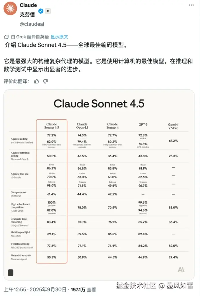 AI圈最近的动静可真不小,但没有哪个消息能像Anthropic在2025年9月29日抛出的这枚"王炸"更让人心潮澎湃了------他们正式发布了Claude Sonnet 4.5。 Anthropic官方可没客气,直接把它定位成"全球最强的AI编程模型"、"构建复杂智能体最强的模型",甚至还是"最擅长使用电脑的模型"。听起来是不是有点像科幻电影里的情节?但这次,它真的来了。