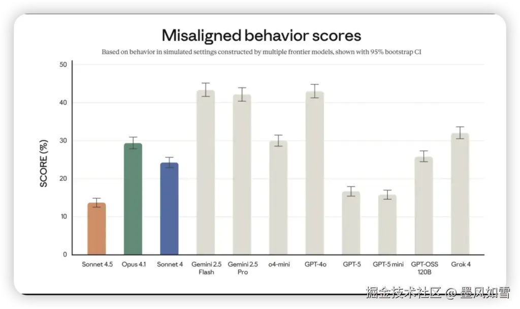 除了能力飙升,Anthropic对AI的"三观"培养也没落下。Sonnet 4.5被誉为Anthropic迄今为止"对齐度最高"的前沿模型,它按照ASL-3安全框架发布,显著减少了不当反射行为,有害内容误报率降低了十倍。这意味着它在企业级高标准环境中更加可靠、值得信任。