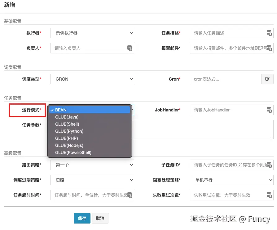 在管理后台新增任务时,可以指定任务的运行模式: