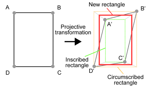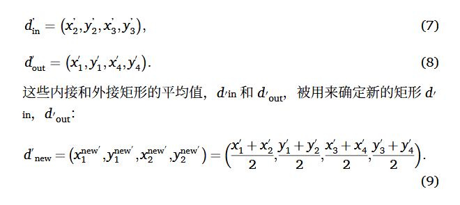 - 矩形校正:将xʹA, xʹB, xʹC, xʹD 按升序排列得到xʹ1,xʹ2,xʹ3,xʹ4, ,yʹ1,yʹ2,yʹ 3,yʹ4同理。内接矩形dʹin 和外接矩形dʹout 定义如下: