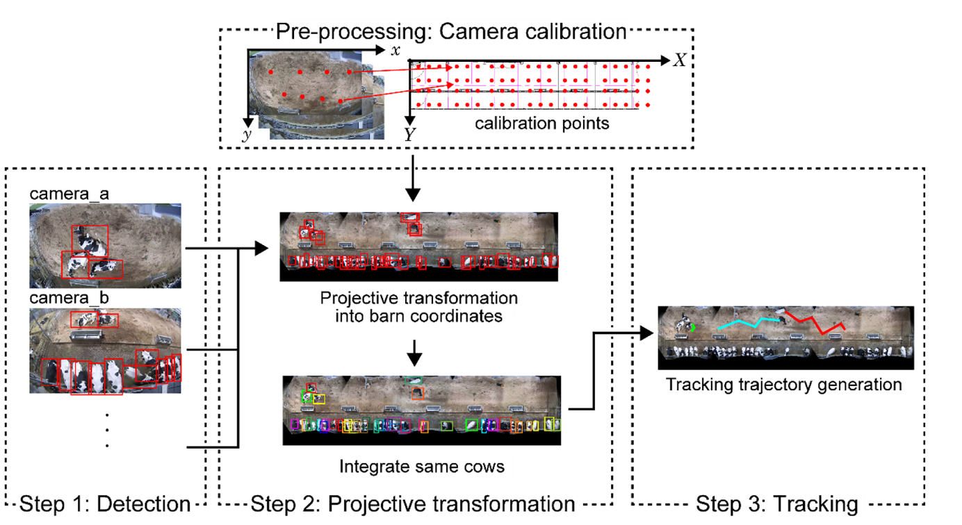 - 预处理:相机标定。 计算来自天花板相机和实际牛舍坐标之间的对 应关系,以便在统一的牛舍坐标系中处理位置信息。