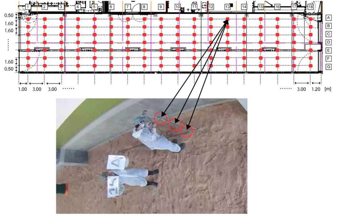 使用了条形网格图像,该网格以3.0米(宽度)和 1.6米(高度)的间隔放置,从左上角开始,如图图7所示。这些条形以0.5 米的间隔涂成红色,用于绘制它们在相机图像和畜舍地图中的位置对应关系。