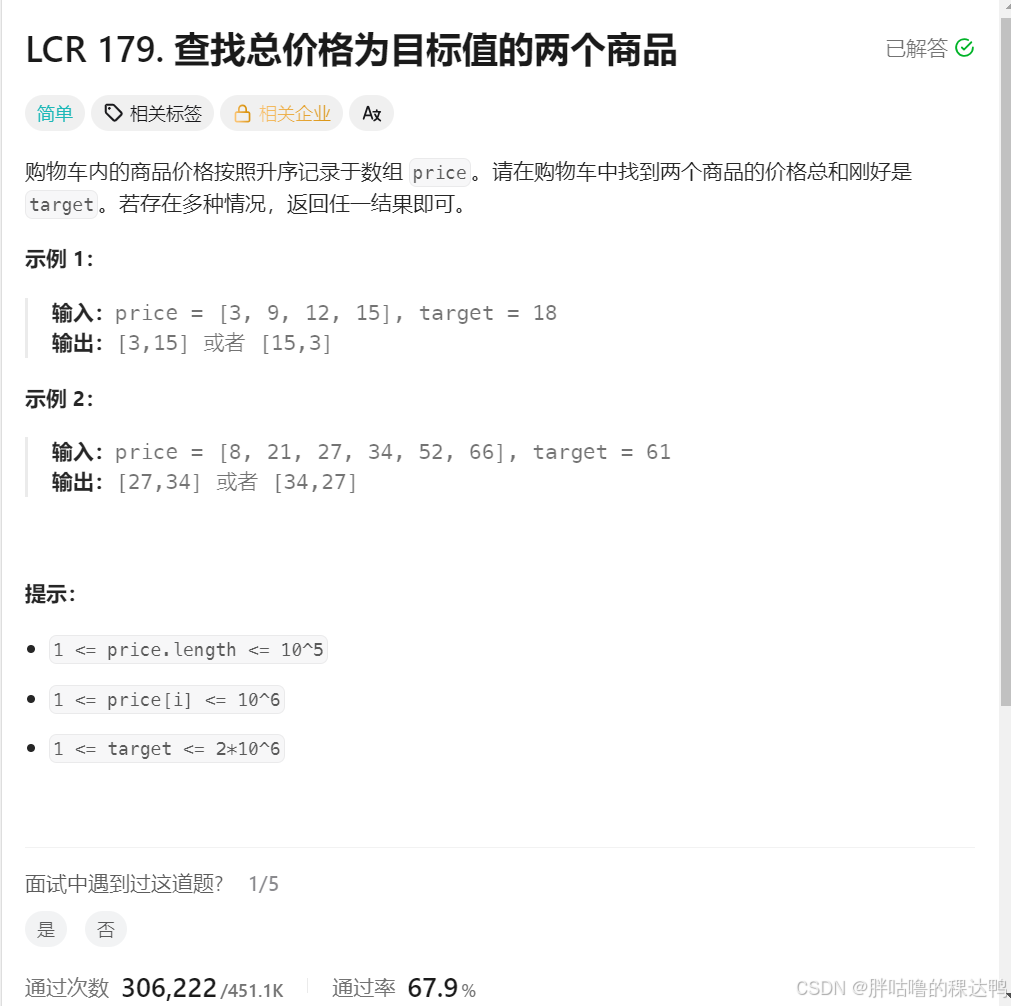 查找总价格为目标值的两个商品(剑指offer题目)