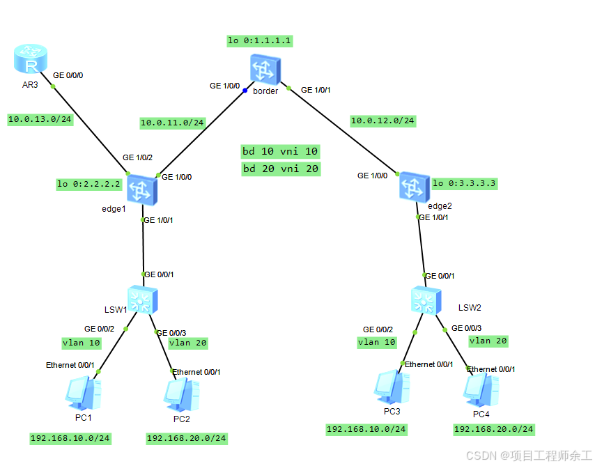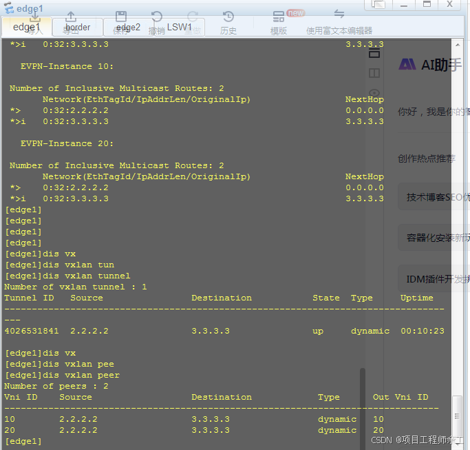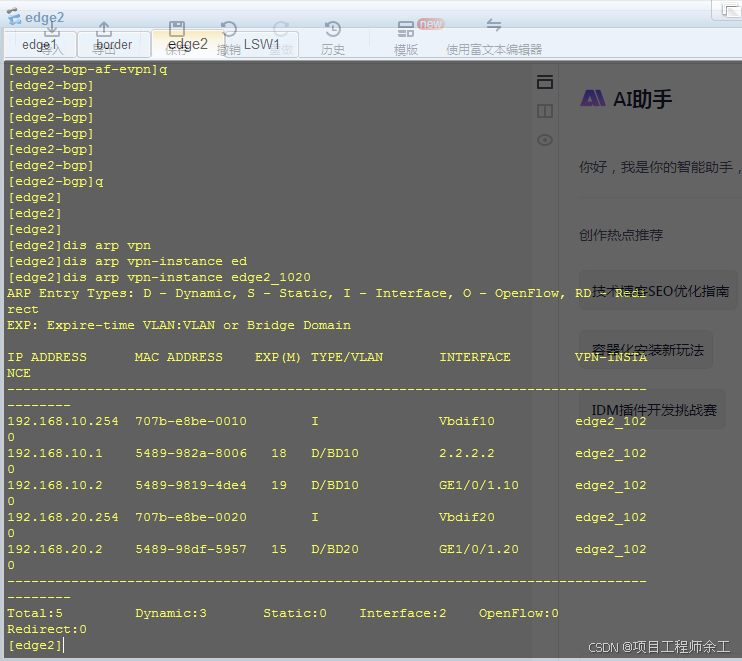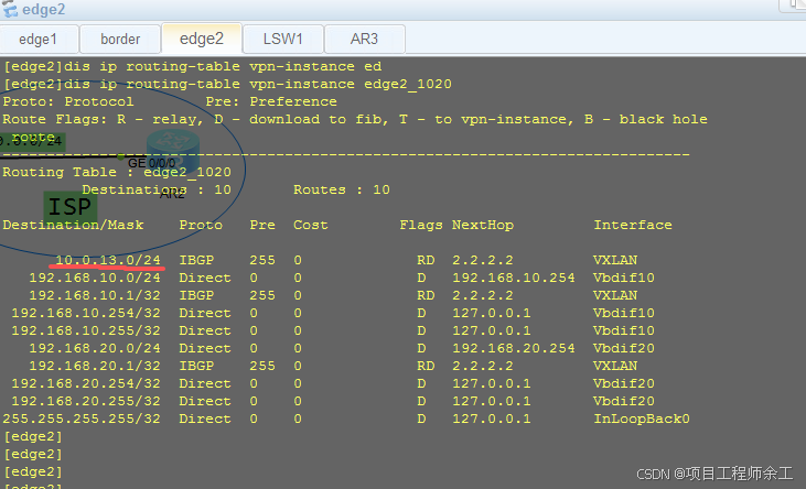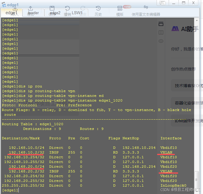 6、vbdif接口中绑定,把ip vpn实例中把bd和ip vpn关联起来,一个ip vpn实例可以 绑定多个bd