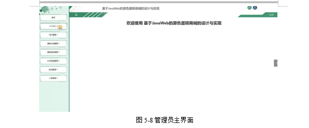 管理员进入系统主页面,主要功能包括对首页、个人中心、用户管理、蛋糕分类管理、蛋糕商品管理、补货信息管理、系统管理、订单管理等进行操作。管理员主页面如图5-8所示: