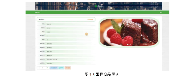用户点击蛋糕商品,在蛋糕商品页面的搜索栏输入蛋糕名称、蛋糕分类,进行查询,还可以查看蛋糕名称、蛋糕分类、蛋糕图片、蛋糕颜色、蛋糕口味、蛋糕尺寸、上货时间、过期日期、单限、库存、积分、价格、会员价,如有需要可以添加到购物车、立即购买或者收藏、评论等操作;如图5-3所示: