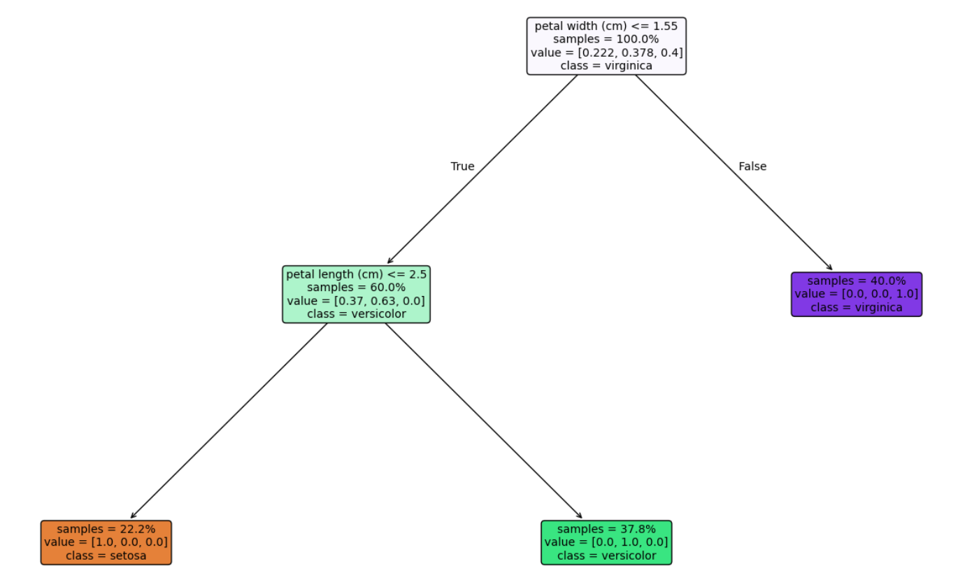 上面的决策树只有三层,其实这主要是在我们定义决策树模型的时候,对参数进行了限制,即进行了预剪枝。防止其过度分裂从而过拟合。
