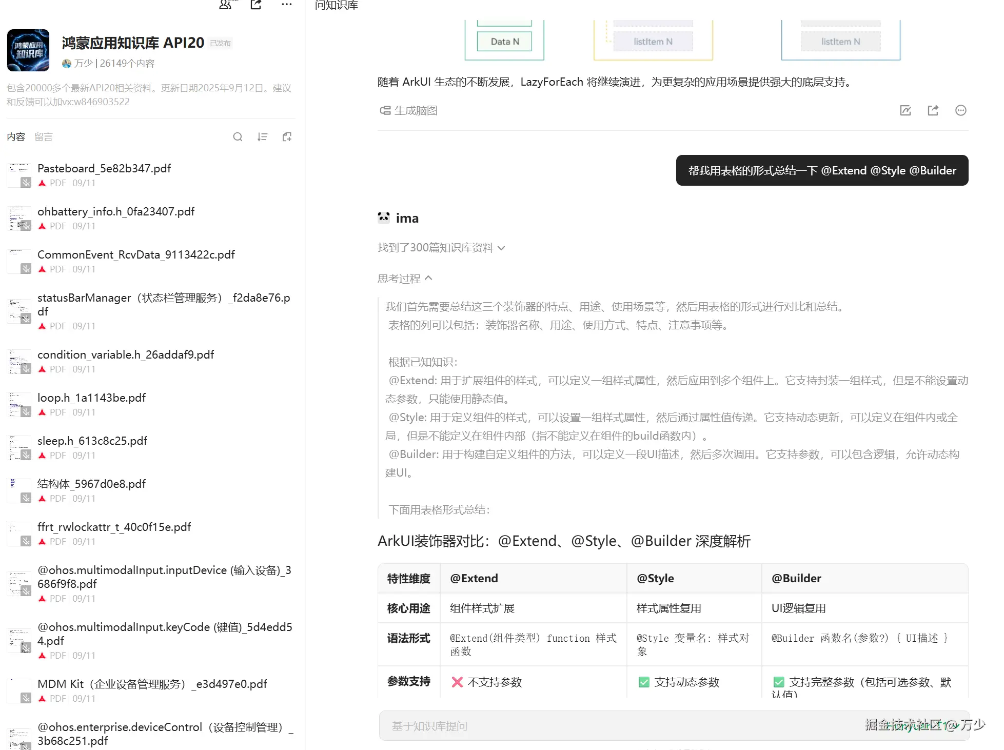 我基于腾讯 Ima和 华为鸿蒙API20搭建的知识库,因为目前华为官方没有提供好用的、自然语言沟通的知识库,所以我搭建了这个知识库,方便学习者基于鸿蒙官方知识进行提问,所有资料都来自于官方,确保资料的权威性,目前用户已经将近到400人了,免费使用。