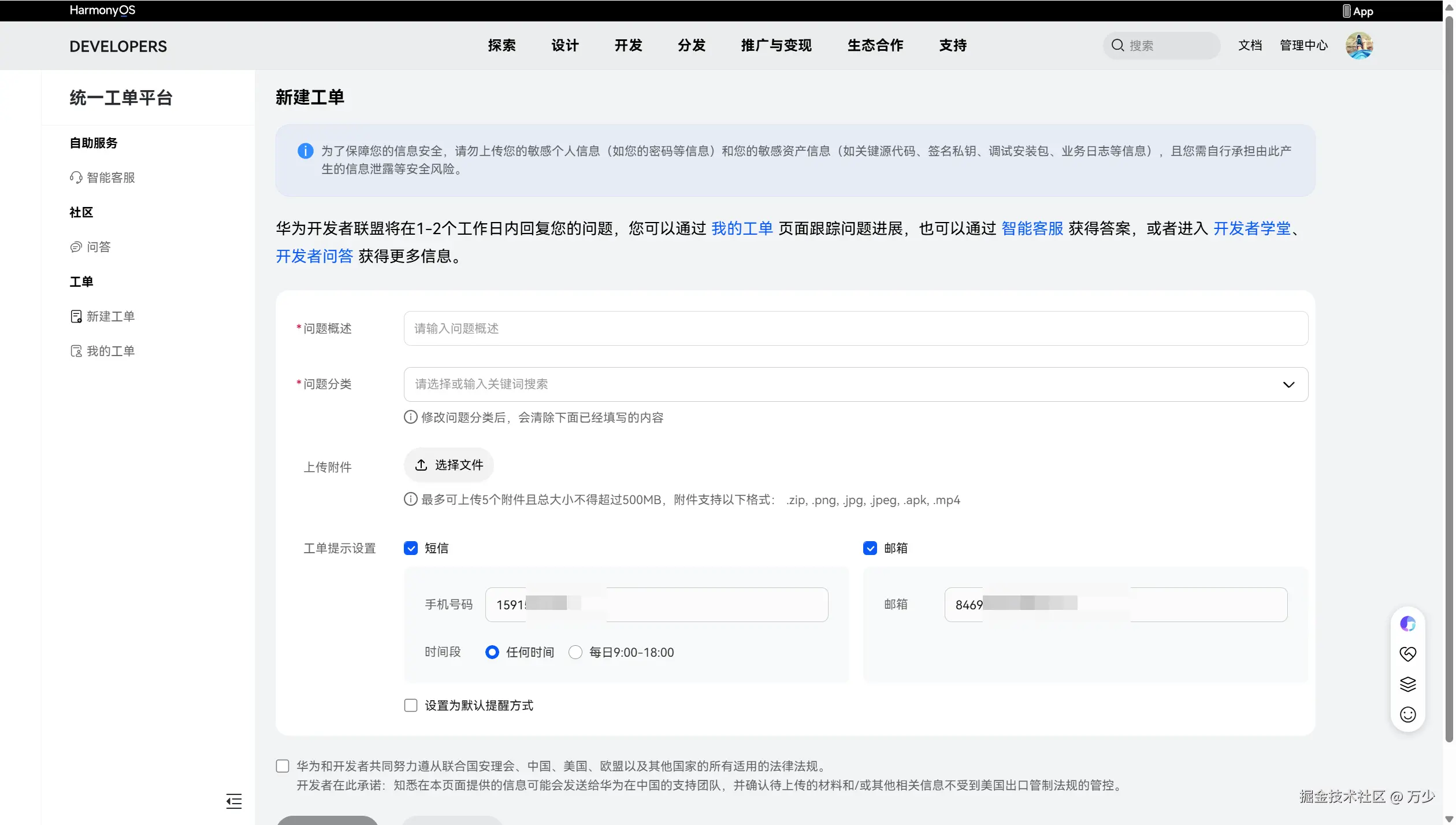 工单系统是在各种渠道都找不到解决方法时,可以把问题抛给华为技术人员,他们会帮我们解决各种各样的开发问题,技术、上架、活动、bug等等都可以。