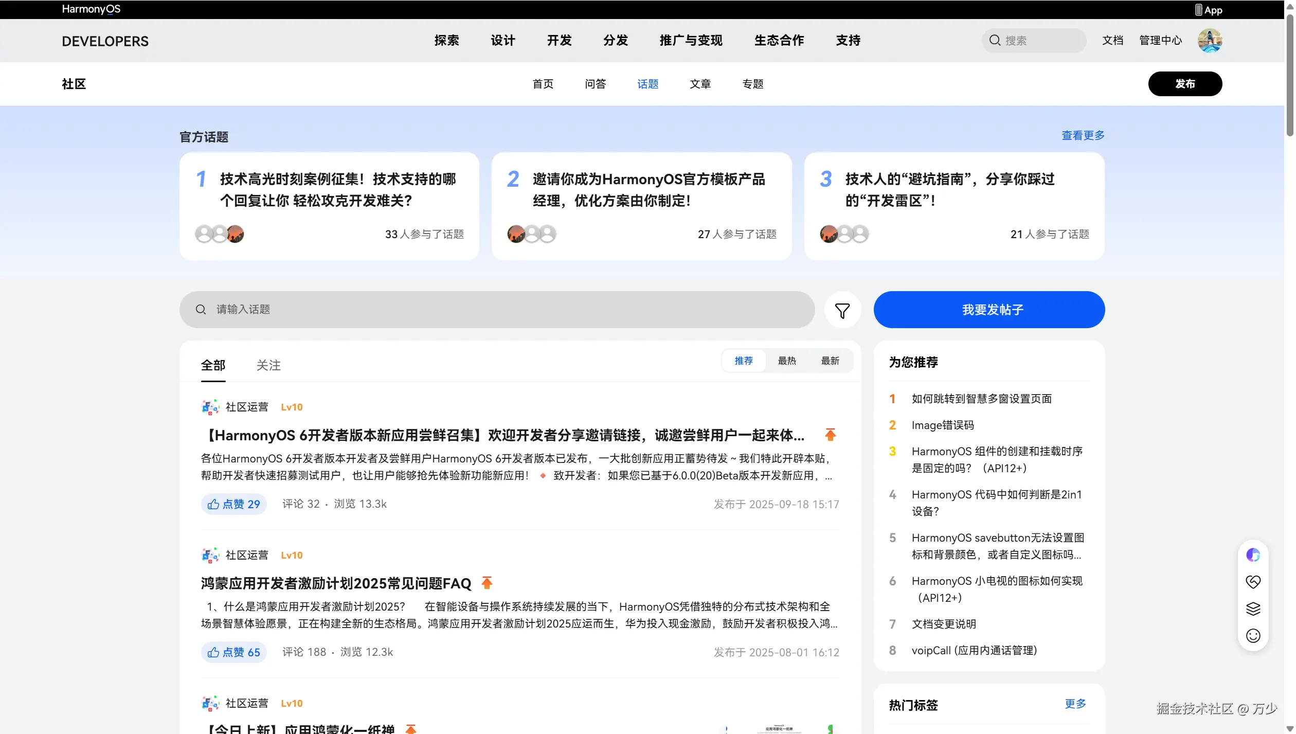 技术论坛,也成为话题,可以允许开发者分享和交流鸿蒙应用开发过程中的技术,也是我经常分享技术文章的位置。