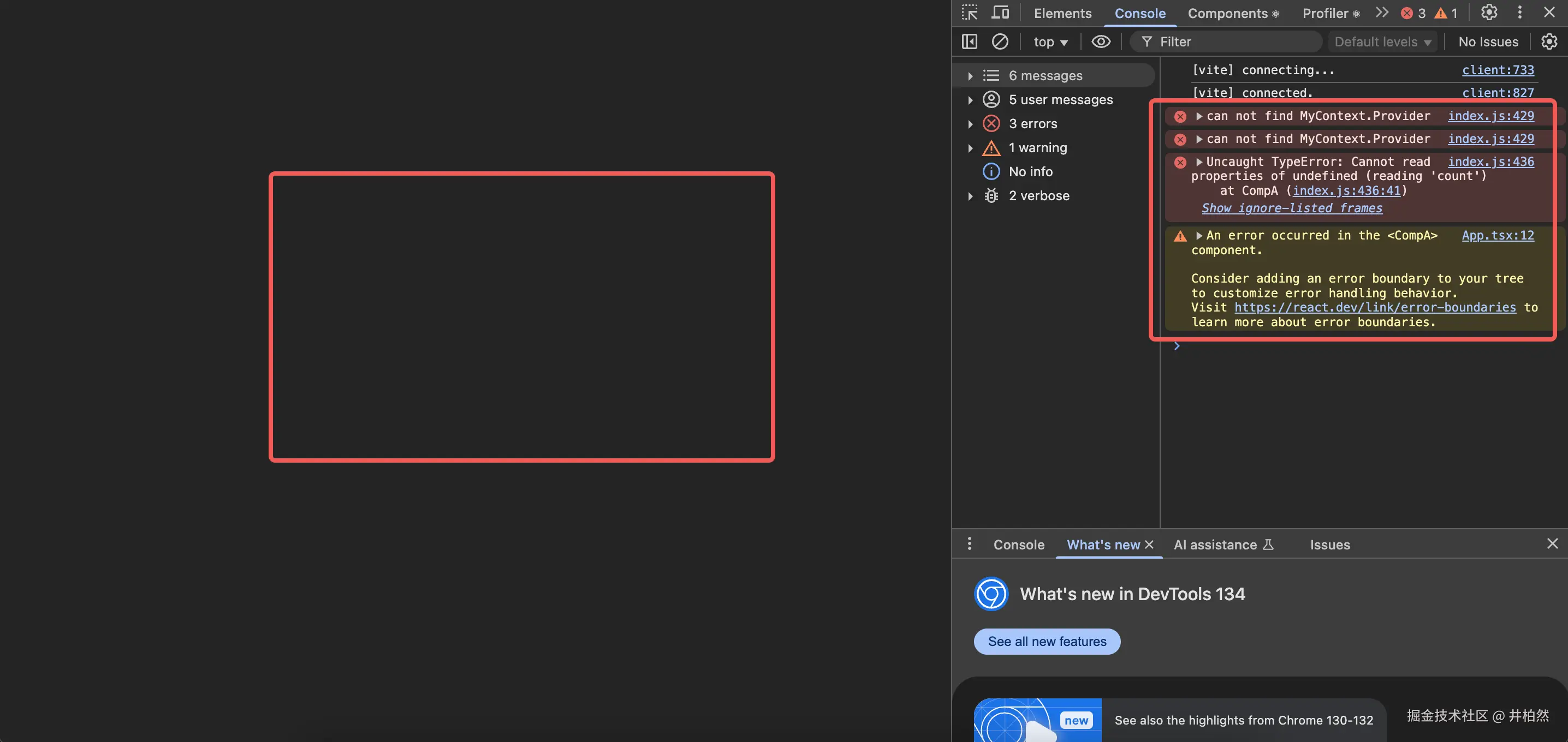 咦,这时候我们可以发现项目直接报错了。并且报错的是找不到 MyContext.Provider