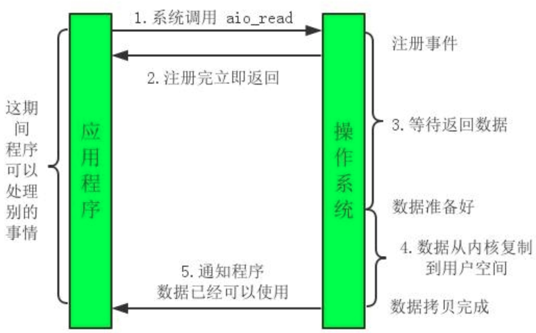 核心思想: 应用线程发起 I/O 操作后立即返回,由操作系统在操作完成时自动通知应用(回调)。