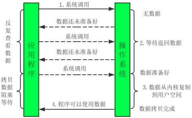 与BIO的明显区别是,发起第一次请求后,线程并没有被阻塞,它反复检查数据是否准备好,把原来大块不能用的阻塞时间分成了许多"小阻塞"(检查),所以进程不断有机会被执行。这个检查有没有准备好数据的过程有点类似于"轮询"。