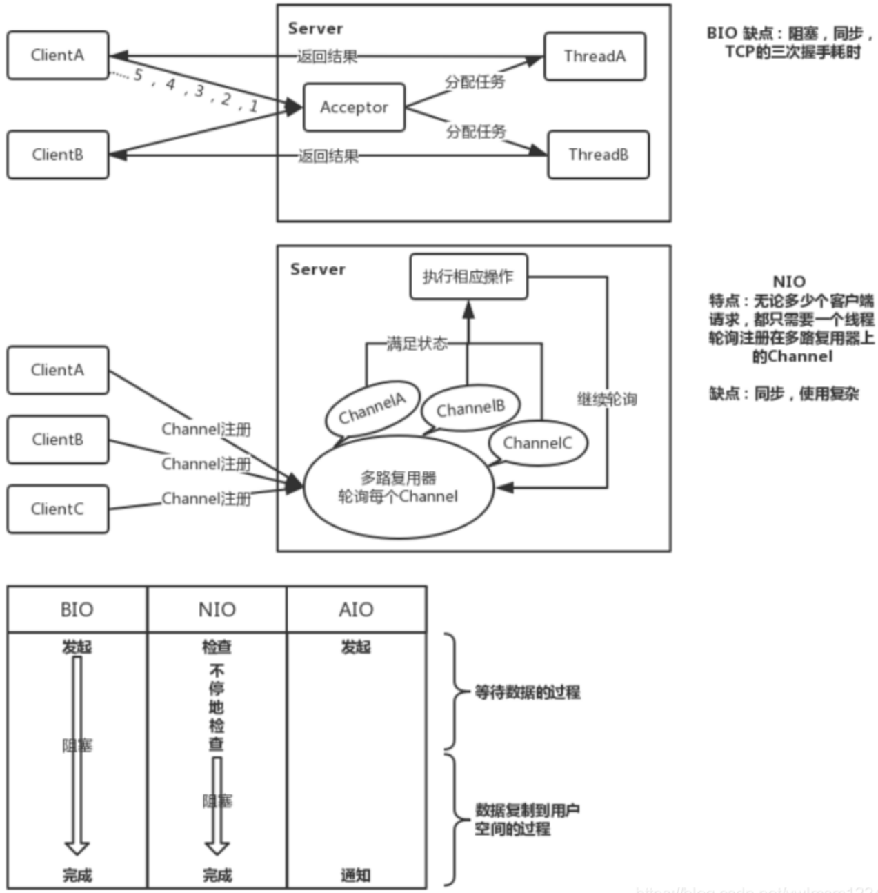 BIO(Blocking I/O):指的是当线程执行 I/O 操作时,如果数据没准备好,就会一直等待,直到数据可用或发生异常才返回。