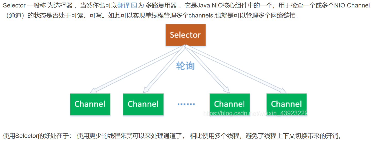 - Selector(选择器):核心机制,将多个 Channel 注册到一个 Selector 上,由它监控这些通道的 I/O 事件