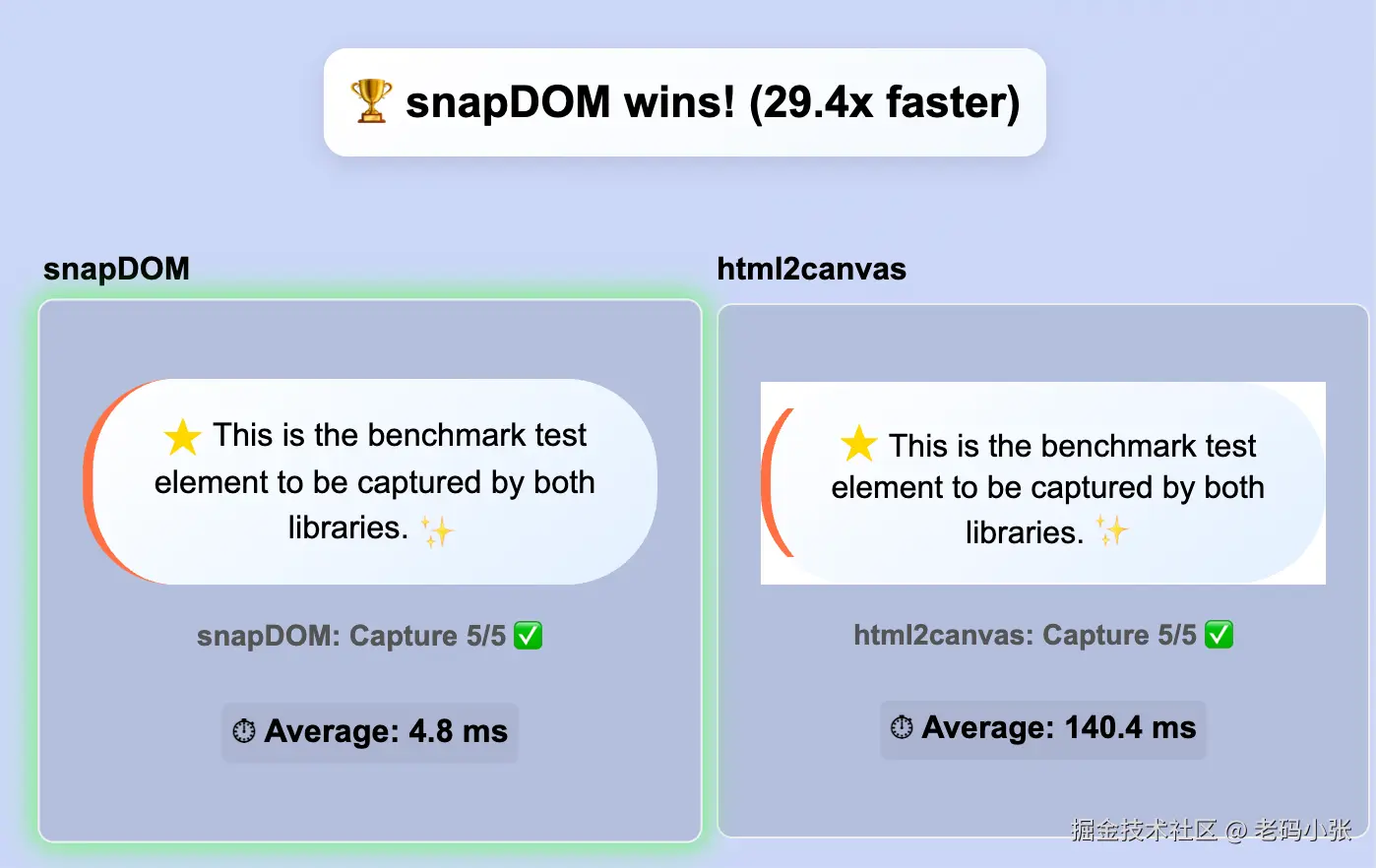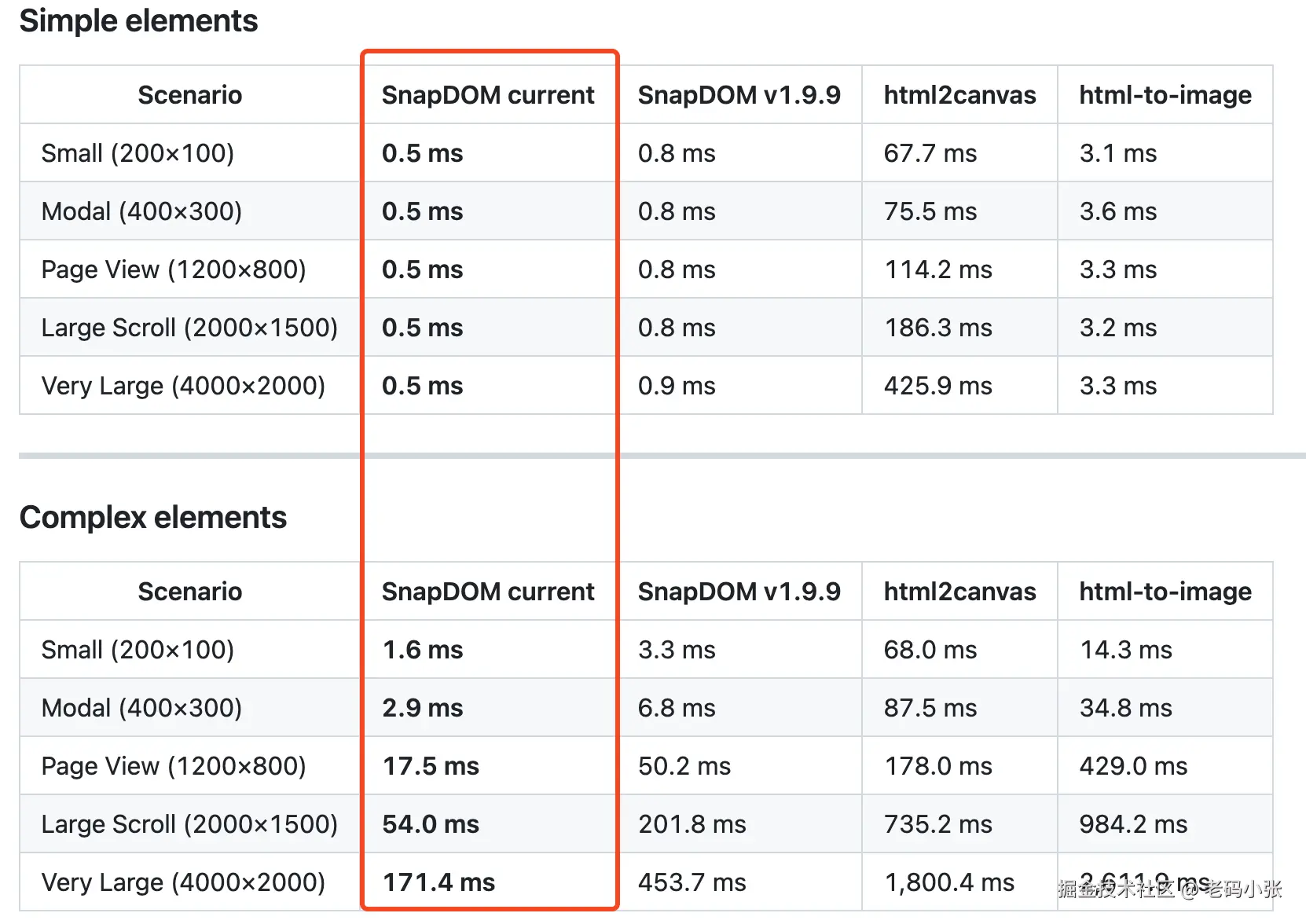 后来我看到一个项目,名字叫 snapDOM。第一眼我就笑了: "哟,这帮人取名字还挺像我。" 第二眼再看文档,我心想:"这玩意儿,可能真行。"而且快,特别快,快得其他的方式都难以望其项背。