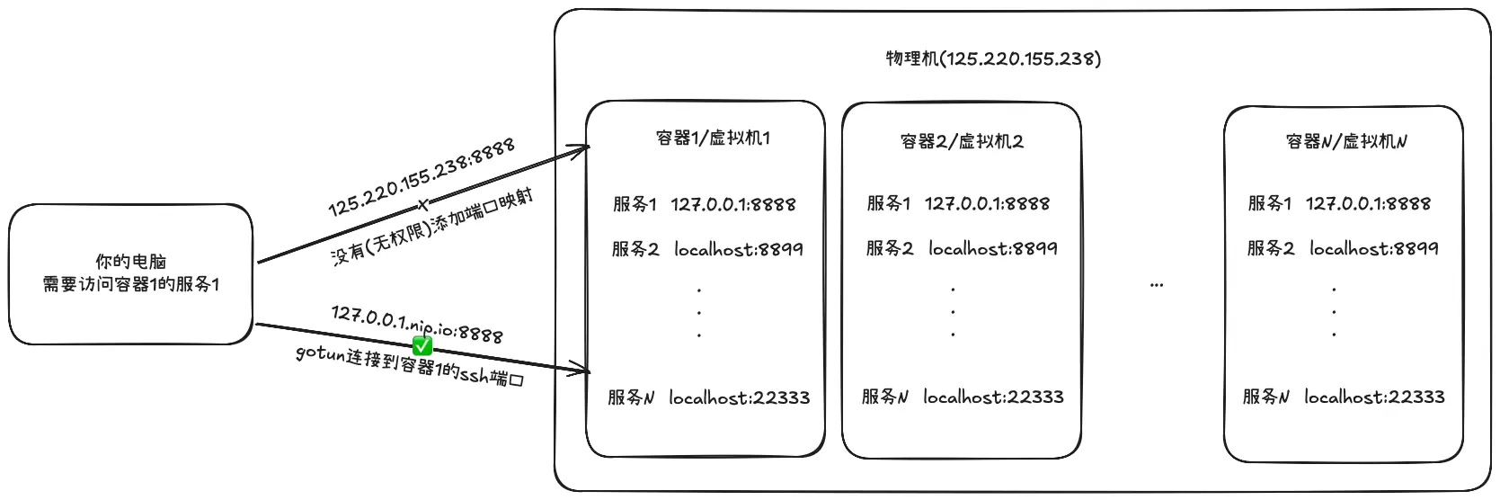你可以部署一个支持 SSH 访问的容器(例如,在容器启动时集成 SSH 服务),并将其 SSH 端口映射到宿主机。然后,在宿主机上运行 gotun,连接到这个容器的 SSH 服务。