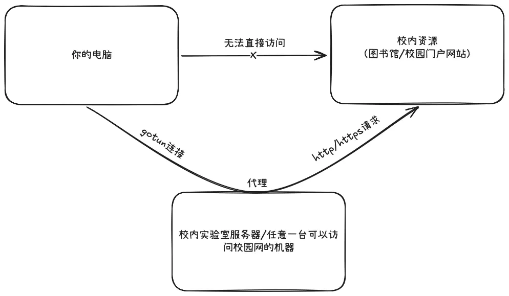 (gotun 默认监听端口)。此时,你的所有代理请求都将通过 SSH 隧道,从校园网内的设备发出,从而实现对校园内网资源的无障碍访问。