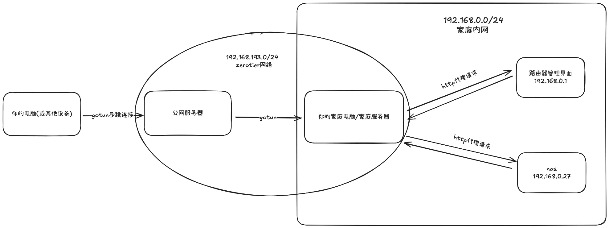 你可以将其理解为:gotun 让你的本地网络请求,通过远程主机这个"跳板",去访问原本不可达的资源。