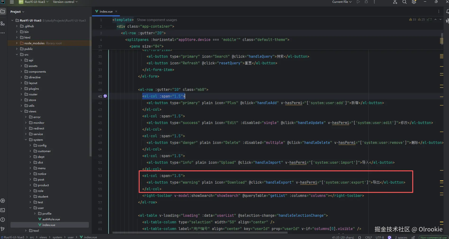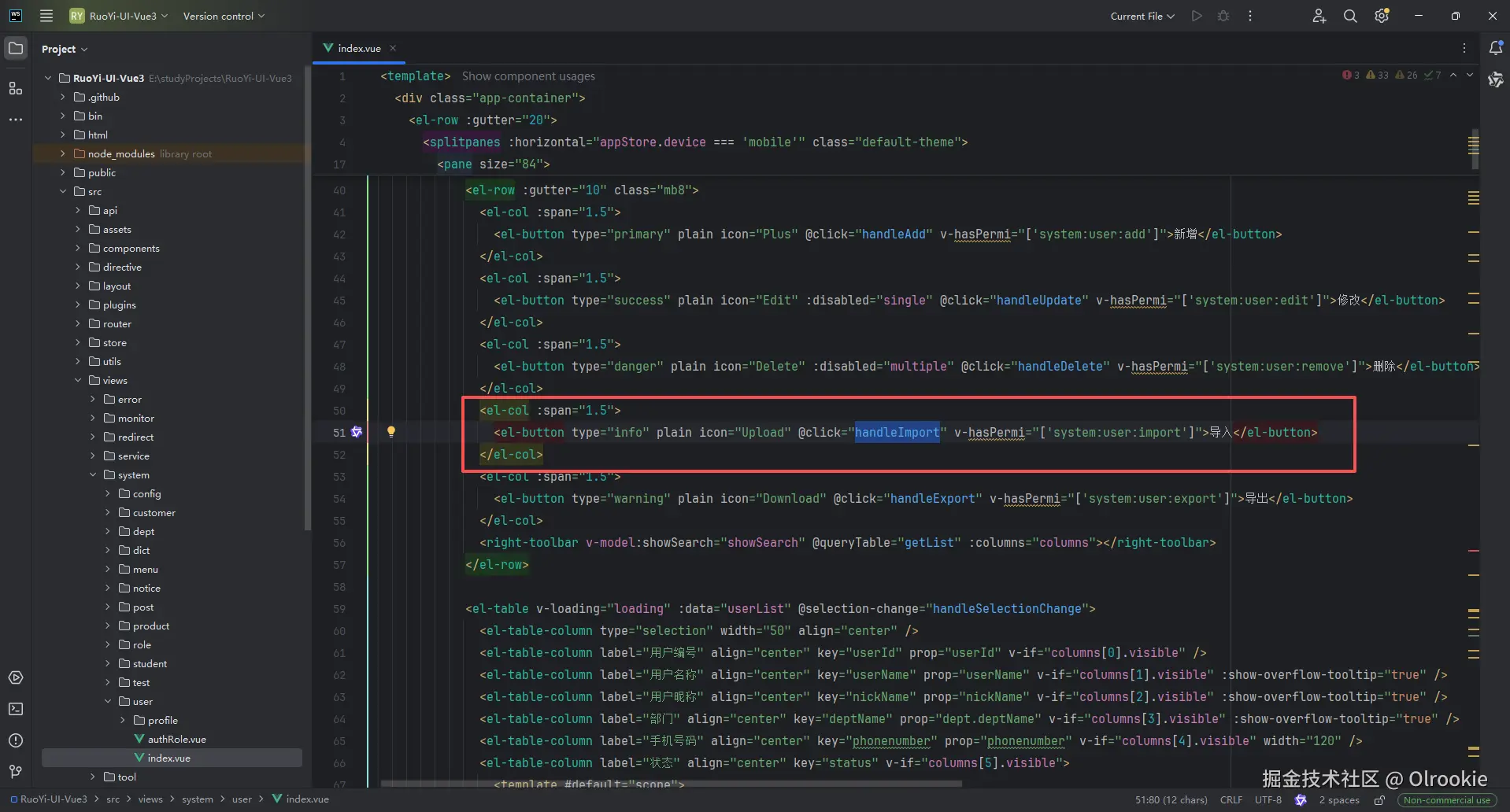 2、添加导入按钮事件 在src/views/system/user/index.vue中新增代码