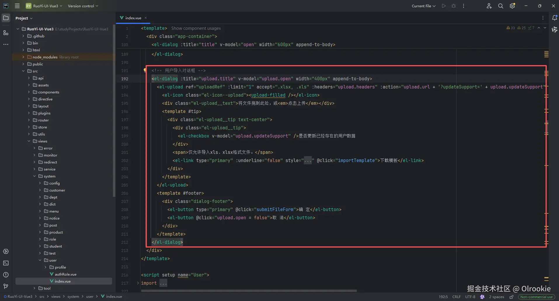 1、添加导入前端代码 在src/views/system/user/index.vue中新增代码