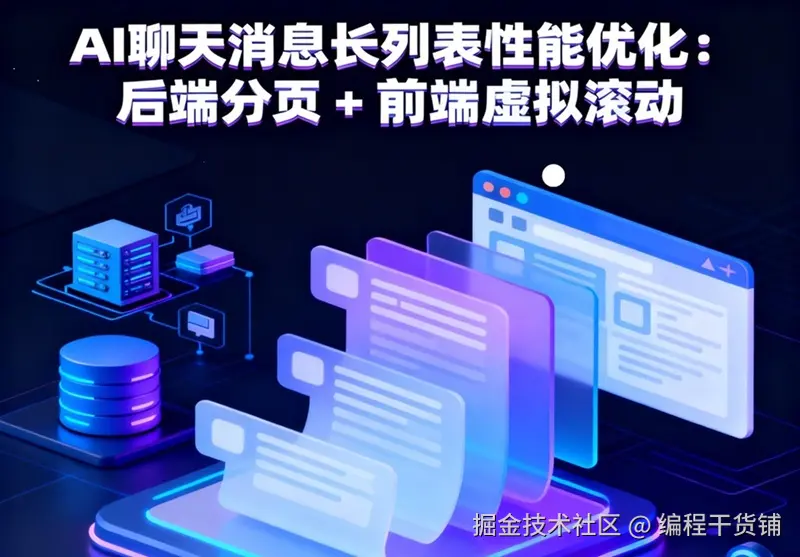 大家好,今天想和大家分享一个我们在开发 AI 多模态聊天应用 时遇到的性能挑战以及解决方案。随着用户使用时间的增加,单个会话的聊天记录可能会积累到成百上千条,这时候性能问题就变得非常突出了。经过一番调研和实践,我们采用了 "后端分页 + 前端虚拟滚动" 的组合方案,效果显著。下面就来详细介绍一下我们的实现思路和遇到的问题。