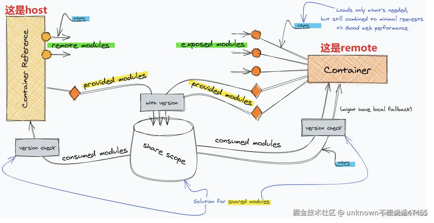 ,而本地host和remote都会进行提供相对应的modules, 在进行使用的时候通过校验share scope