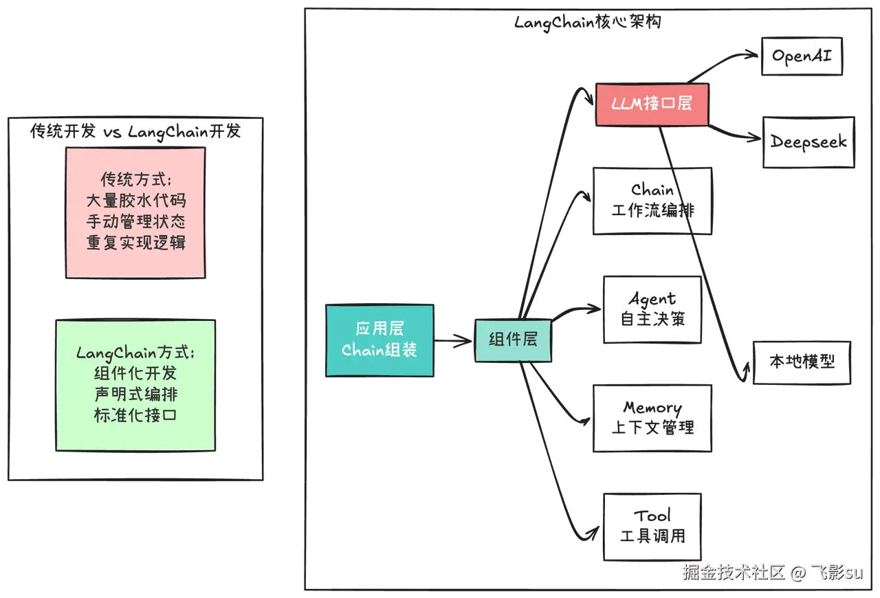 Agent的本质是让大模型具备自主规划任务、调用工具、处理复杂流程 的能力。你需要理解为什么ReAct模式(Reasoning + Acting)能提升推理能力,知道Reflexion如何通过自我反思优化决策,懂得Tree of Thoughts和Chain of Thoughts在处理复杂问题时的根本差异。更关键的是,你要会用LangChain和LangGraph这两个框架。LangChain不只是一个工具库,它代表了一种新的AI应用开发范式------把原本需要大量胶水代码的LLM应用开发变成了组装积木式的编程。