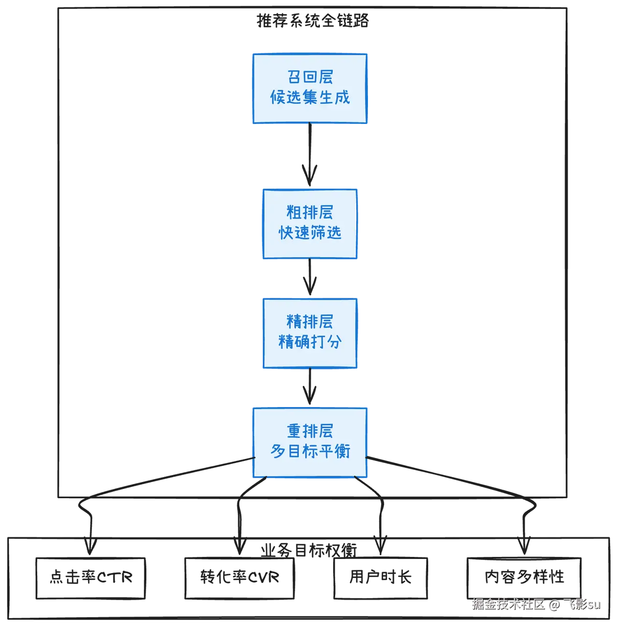 所以这80道题既包括经典内容(Wide&Deep、DeepFM、DIN、DIEN、DCN这些深度学习模型),也加入了前沿话题:"LLM能直接做推荐吗?和传统推荐模型有什么区别?""怎么用大模型生成推荐理由?""推荐系统的Prompt怎么设计?"这些都是2025年面试的新考点。更重要的是,我加入了"推荐系统全链路"的系统性思考:从召回到粗排到精排到重排,每一层在干什么,为什么要分这么多层,不同层的模型复杂度怎么权衡。