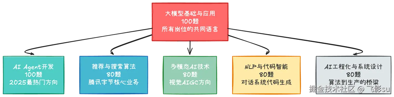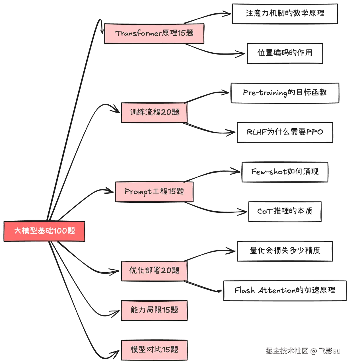 当我把所有岗位要求铺开在面前,用荧光笔标出高频关键词时,发现 "大模型基础"出现的频率是90+% 。无论是腾讯的推荐算法、阿里云的AI应用开发,还是字节的Agent算法工程师,面试官都会先问你"Transformer的Self-Attention是怎么算的"、"RLHF的训练流程是什么"、"大模型的幻觉问题怎么缓解"。这就像盖房子,地基不牢固,上层建筑再漂亮也会塌。所以我打算以 大模型基础与应用 作为第一个方向,梳理出100道常考题。