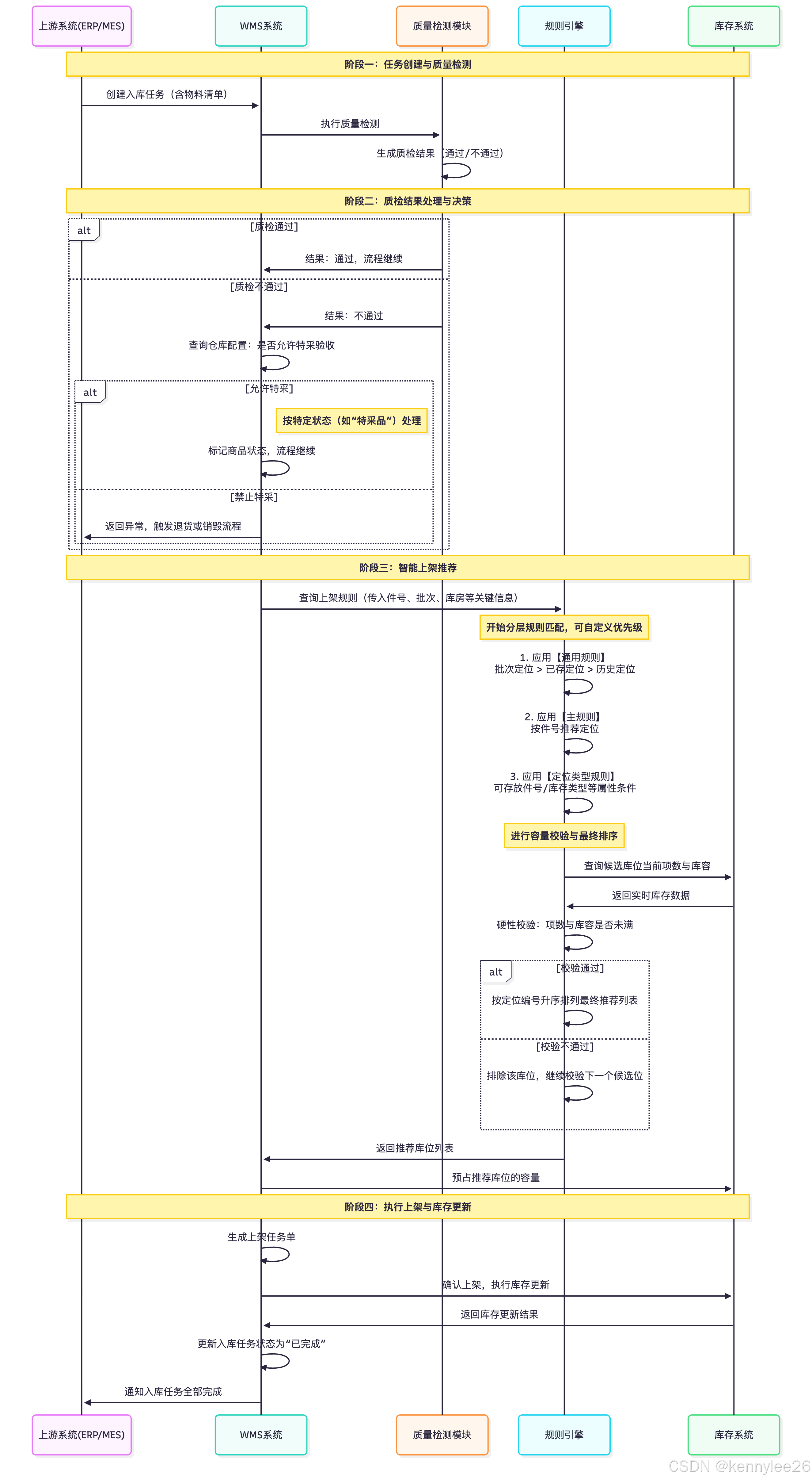 国庆期间抽空回顾了一下去年完成的 WMS 系统项目后的一些经验。这次总结希望从 技术与业务融合的视角 出发,系统性解析 WMS(仓储管理系统)在 入库、出库、库存管理 全流程中的设计逻辑与系统机制,重点探讨其背后的 规则驱动决策 与 库存精度控制 的技术实现原理。