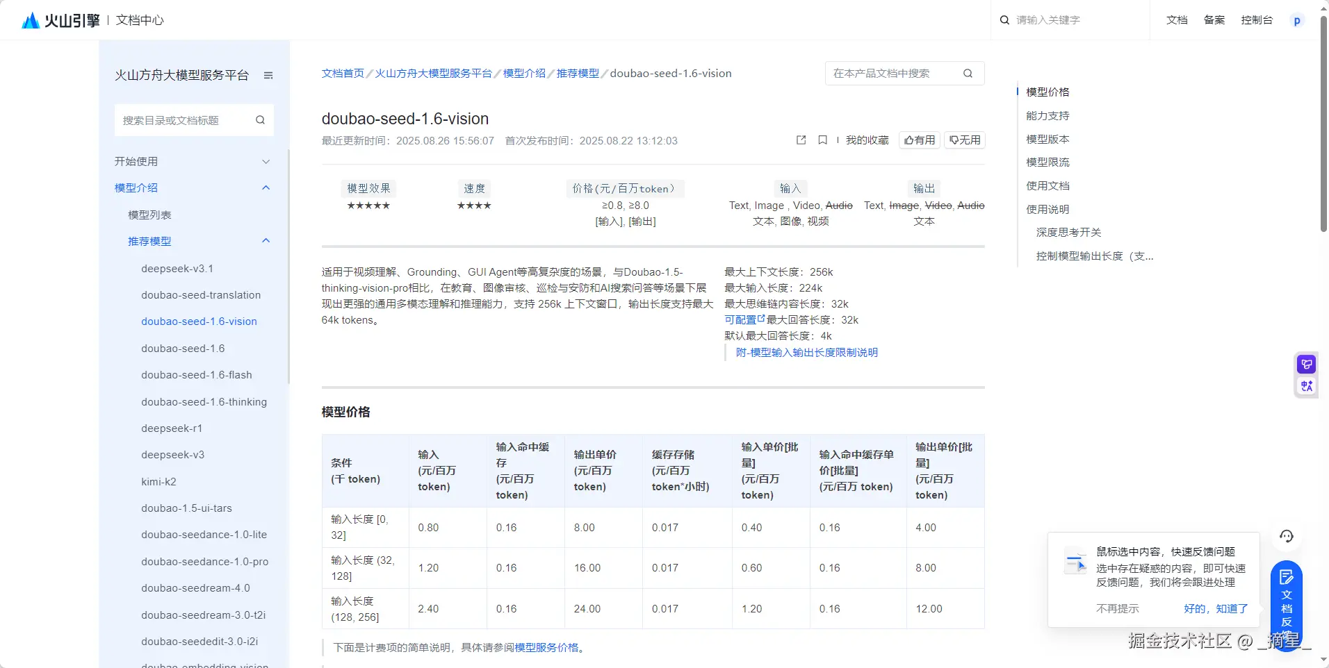 doubao-seed-1-6-vision:适用于视频理解、Grounding、GUI Agent等高复杂度的场景,与Doubao-1.5-thinking-vision-pro相比,在教育、图像审核、巡检与安防和AI搜索问答等场景下展现出更强的通用多模态理解和推理能力,支持 256k 上下文窗口,输出长度支持最大 64k tokens。