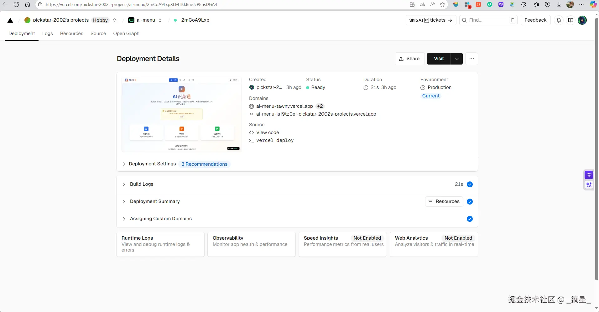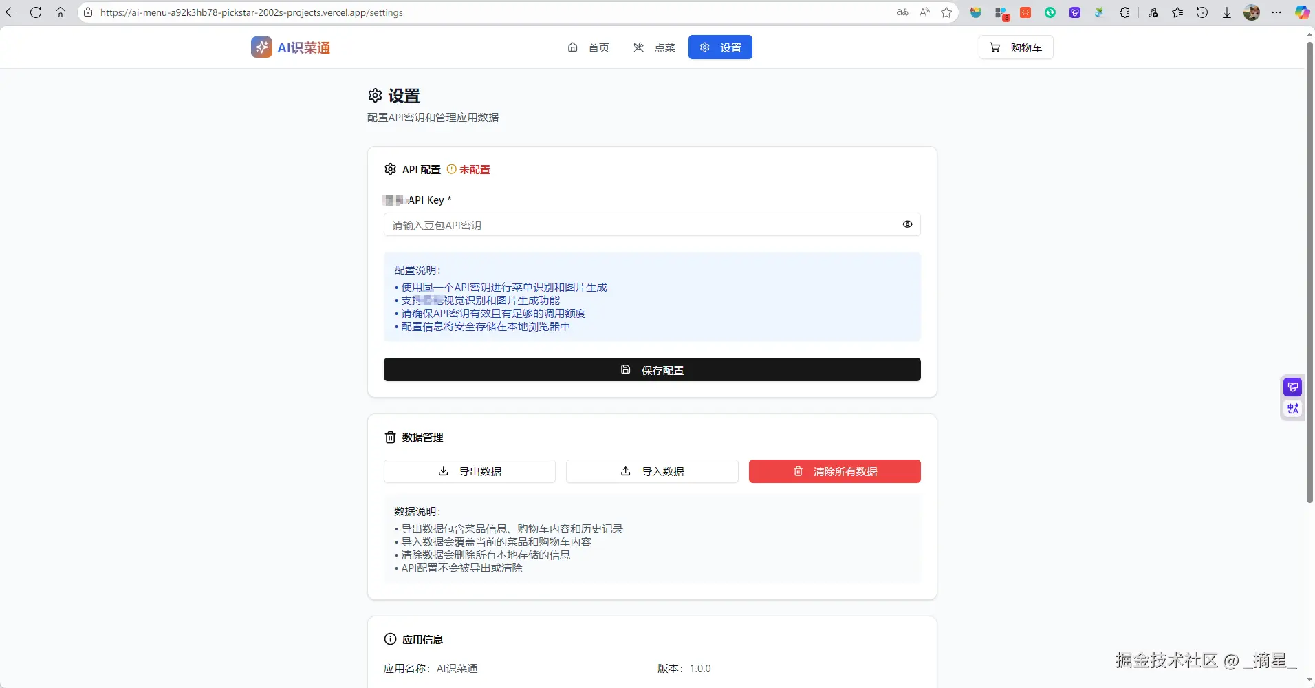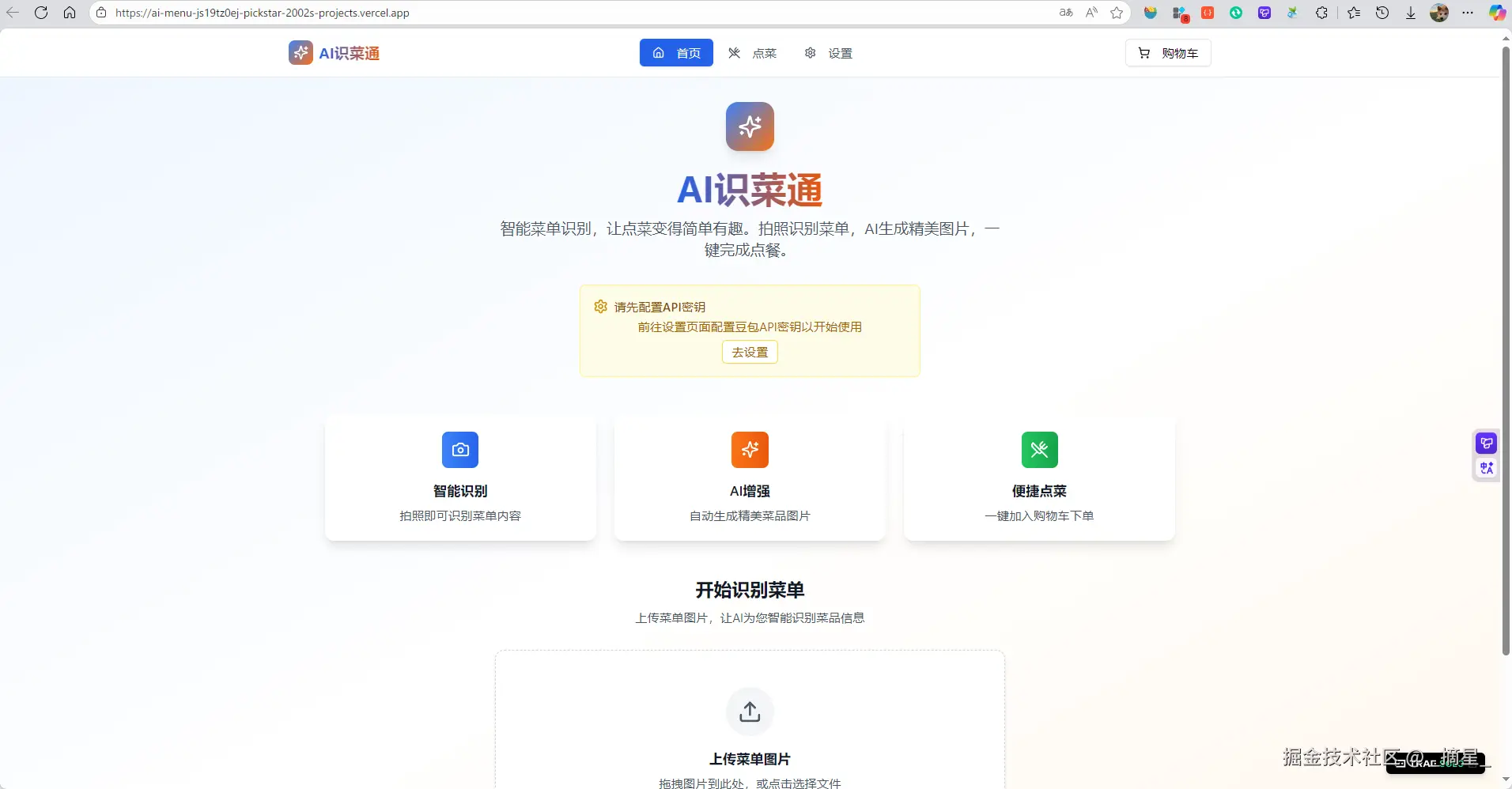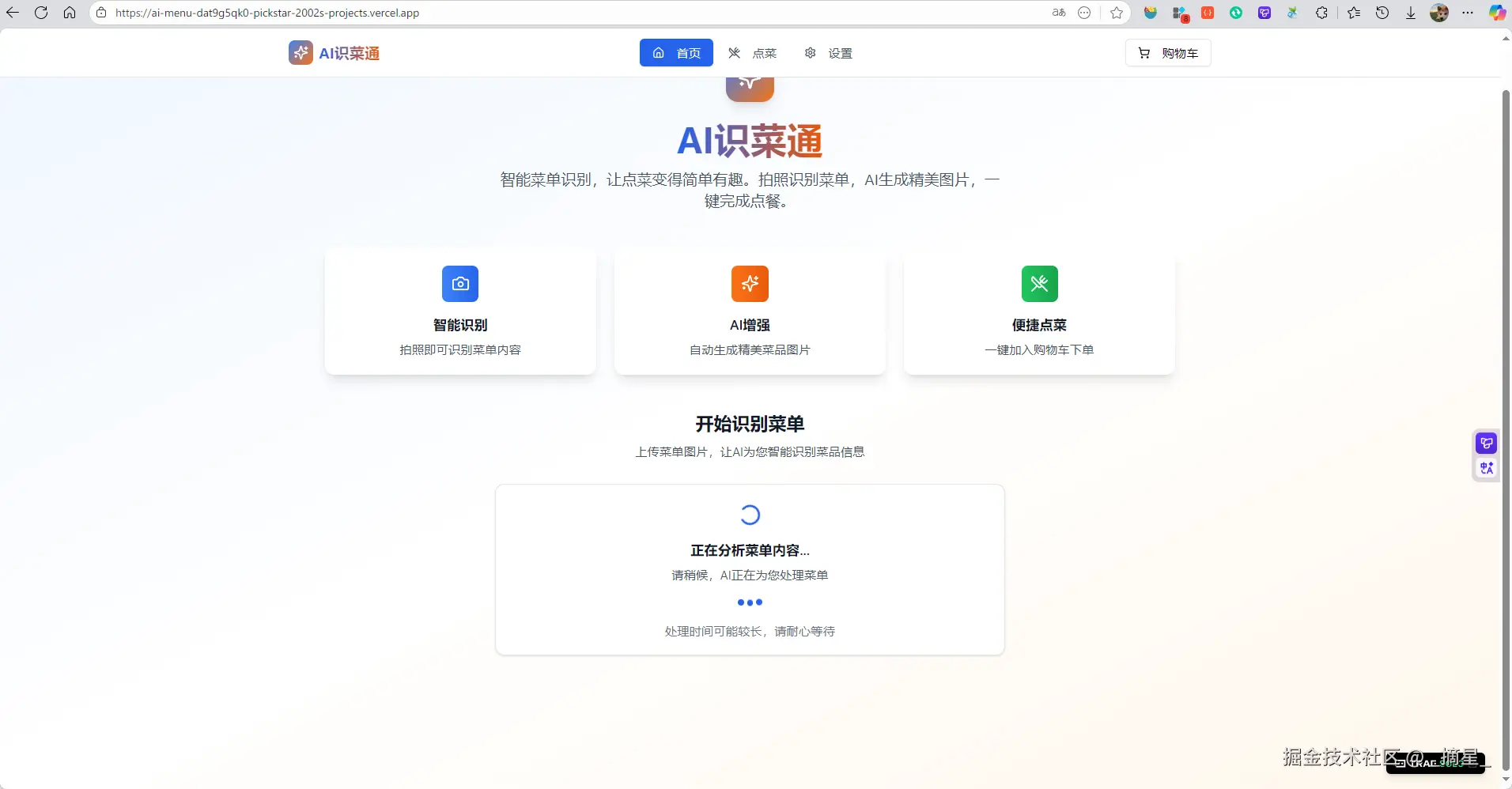 在项目"AI识菜通"的最终部署阶段,我选择了 Vercel 作为前端应用的托管平台。Vercel 以其卓越的开发者体验和对现代前端框架的深度支持,极大简化了部署流程。本项目基于 React 构建,并使用了 shadcn/ui 和 Radix UI 组件库,Vercel 能自动识别项目结构,实现一键部署和持续集成。每次代码推送至 GitHub 仓库,Vercel 都会自动构建并生成预览链接,方便快速测试与迭代。更重要的是,Vercel 提供全球边缘网络分发,确保用户无论身处何地,都能快速加载应用页面。整个"AI识菜通"从前端交互、图片上传,到调用腾讯混元大模型进行多语言菜单识别与菜品图像生成,最终生成点餐字符串,全部通过 Vercel 高效、稳定地交付给用户。借助 Vercel 的免费计划和无缝 DevOps 能力,我得以将精力聚焦在核心 AI 功能开发上,而无需担心服务器运维,真正实现了"开发即部署"的现代 Web 开发体验。ai-menu-a92k3hb78-pickstar-2002s-projects.vercel.app/