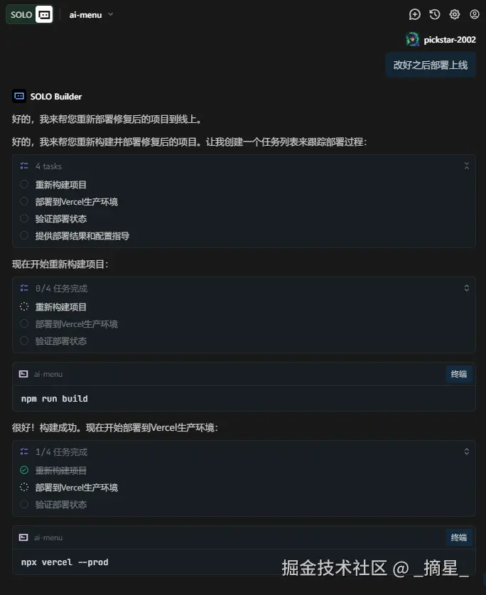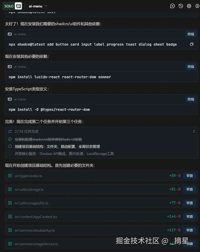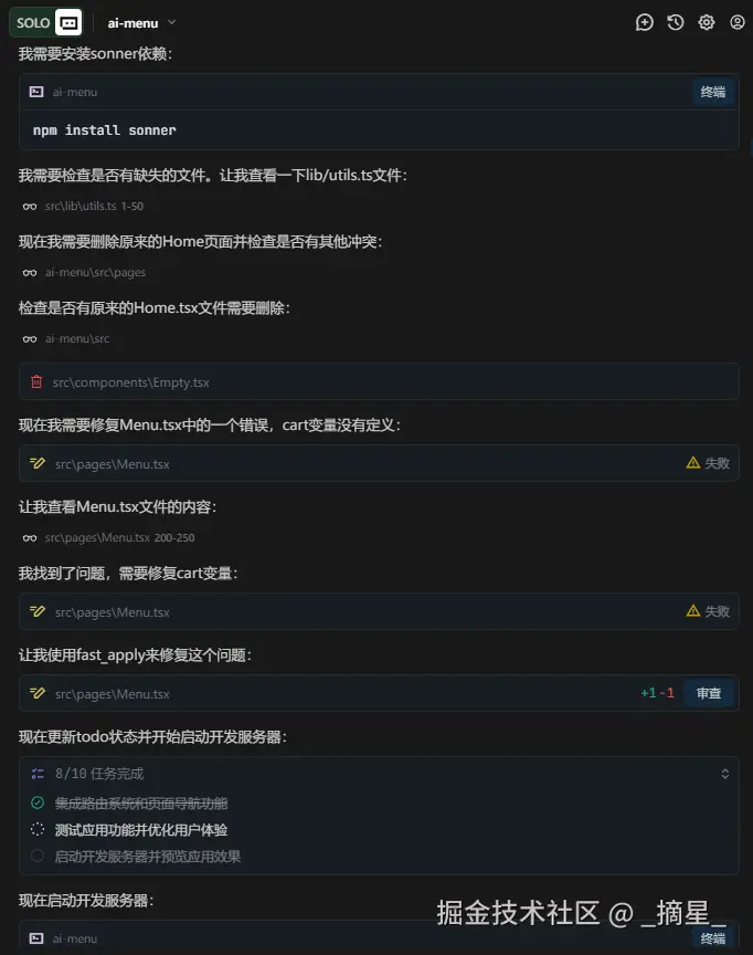 Trae Solo会在开发的过程中自动下载依赖、创建配置文件、生成函数、运行终端,运到的问题也都会被当做上下文继续完善开发,不愧是国产之光,第一位上下文工程IDE,让整个从0到1的过程无比丝滑流畅: