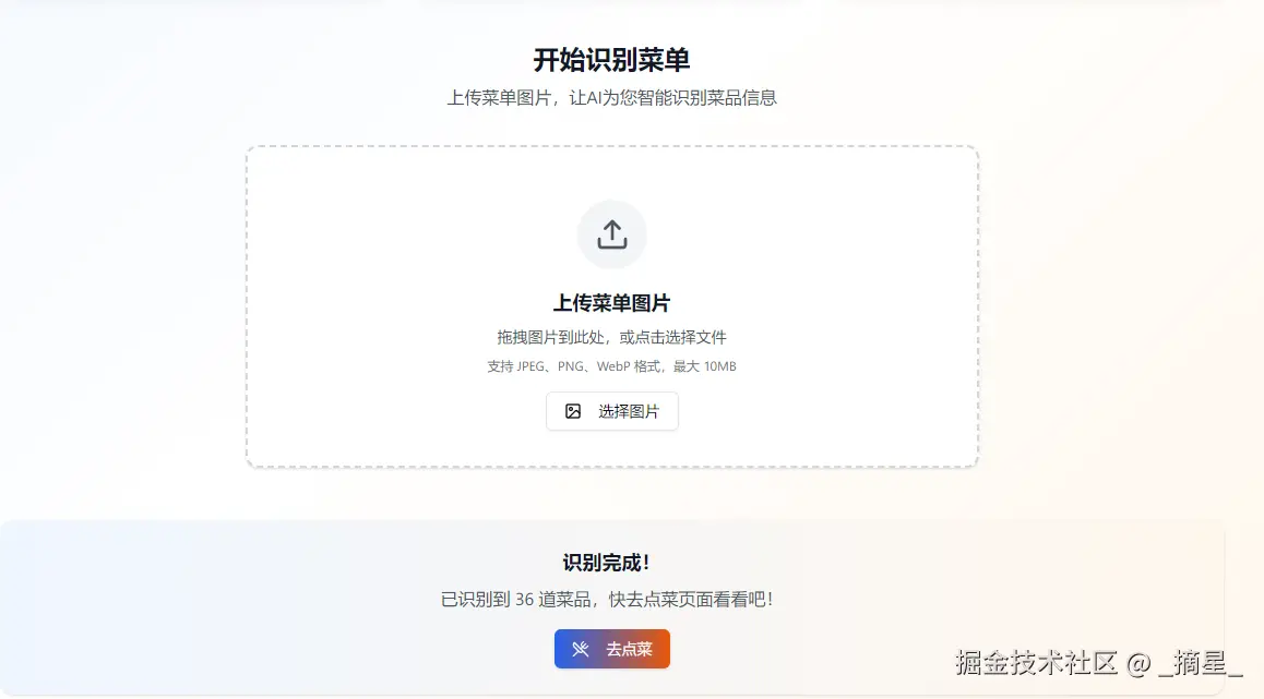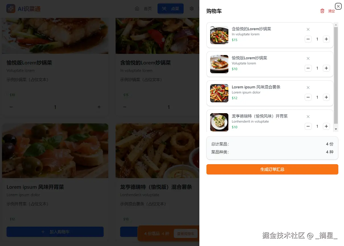 在人工智能技术迅猛发展的今天,大模型正以前所未有的深度与广度渗透进日常生活的各个场景。从智能客服到内容创作,从代码生成到图像理解,AI 正在重塑人与信息、人与服务之间的交互方式。而在餐饮这一高频、高感知的领域,语言障碍与菜单理解困难长期困扰着跨国旅行者、留学生乃至本地食客------面对一张满是陌生文字或模糊排版的菜单,如何快速识别菜品、理解其风味、并准确下单?正是在这一现实痛点驱动下,我们开发了"AI识菜通"------一款融合多模态感知、跨语言理解与生成式视觉的智能点餐助手。