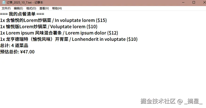 点击生成订单汇总,会生成一份刚刚的点菜TXT格式的清单: