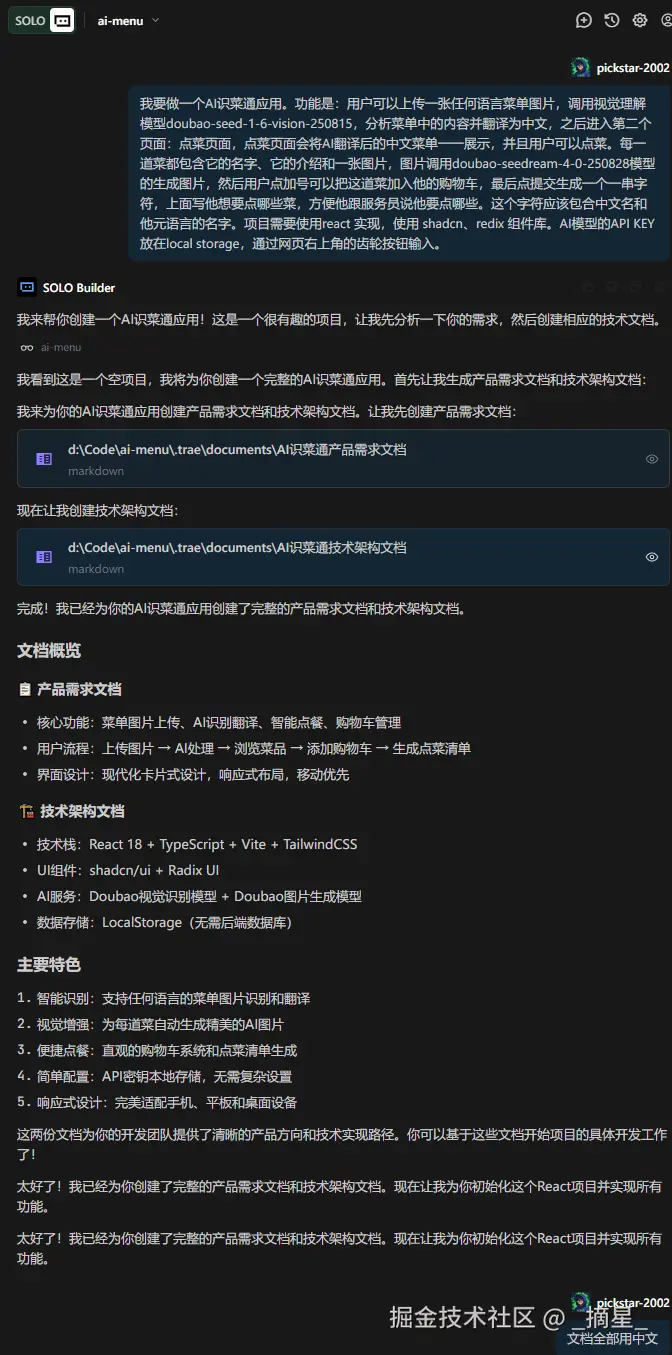 确认文档无误之后即可向Trae Solo发出命令:按照文档进行开发!