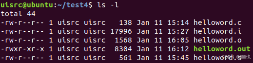 使用 ls 查看文件列表,可执行文件 helloword.out 就产生了: