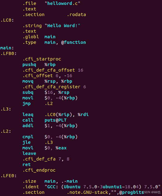 编译:将 c 语言翻译成汇编语言 ,同时这个阶段也会进行语法检查 ,我们得到的 error 与 warning 都是在这个阶段给出的。.i 文件会被翻译成.s 的汇编文件,可以打开查看,学习过汇编的同学应该会很熟悉其中的代码指令。