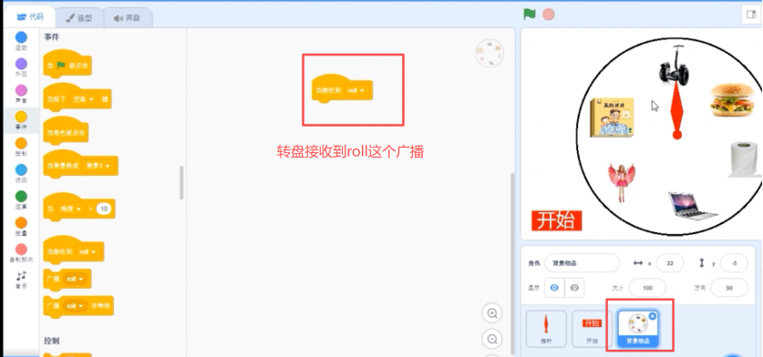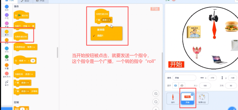 3.设置开始按钮,当角色背点击,就发出一个广播"Roll"