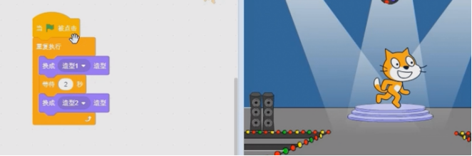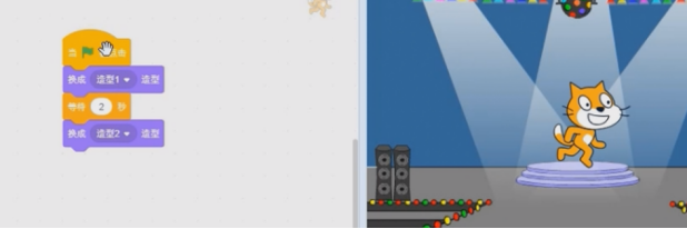 1.在外观中选择换成造型1/2,如果太快了看不到就要添加一个间隔时间