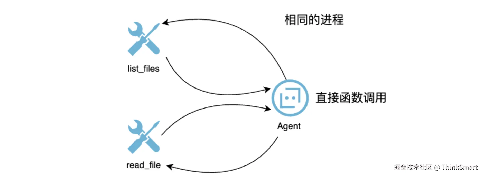 最简单的方式,就是将Tool和Agent放在同一个程序里面,直接通过函数调用的方式就可以进行通信
