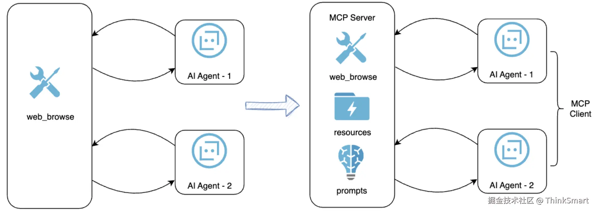 把Tool变成服务,让所有的Agent都来调用,MCP其实就是通信协议,专门用来规范Agent和Tool服务之间是怎么交互的