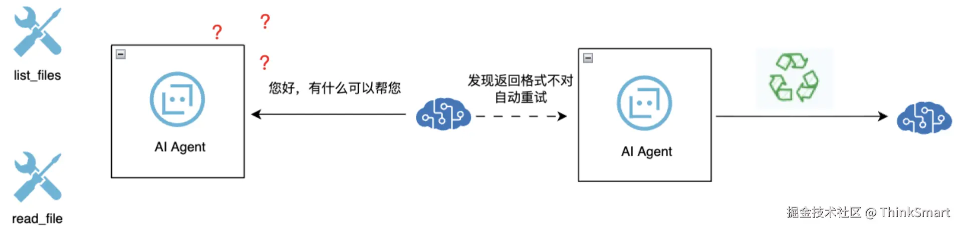 但是AI其实还是一个概率模型,会出现AI返回的格式不对,此时Agent就会进行反复的重试(消耗很多Token)